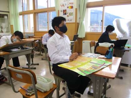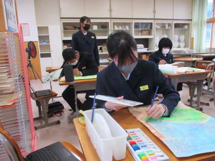 1年1限 美術 公開日 2021/11/02 更新日 2021/11/02 日々の活動から 11月2日(火) 1年生の美術の授業の様子です。 先月、グラウンドで写生してきた下絵に色付けをしています。 今月の学習発表会までに完成して、展示する予定です。