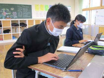 2年1限 「総合的な学習の時間(楡の木タイム)」 公開日 2021/11/02 更新日 2021/11/02 日々の活動から 11月2日(火) 2年生の「総合的な学習の時間(楡の木タイム)」は、学習発表会に向けて「社会に学ぶ『14歳の挑戦』」のステージでの発表資料を作成しています。 今日は、期間中の写真データを取り込む作業をしていました。