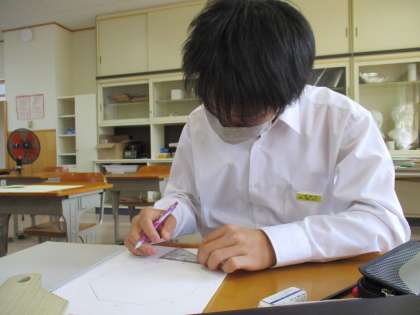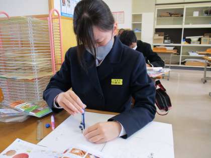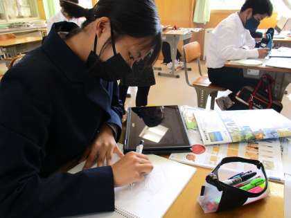 1年2限 美術 公開日 2021/11/02 更新日 2021/11/02 日々の活動から 11月2日(火) 1年生の美術の授業の様子です。 今後、木製の鍋敷きに彫刻をするための準備として、スケッチブックに下絵をかいています。