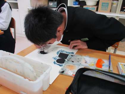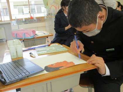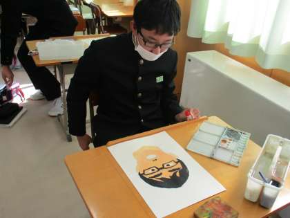 3年3限 美術 公開日 2021/11/02 更新日 2021/11/02 日々の活動から 11月2日(火) 3年生の美術の授業の様子です。 自画像に水彩絵の具を使って着色をしました。 それぞれが個性あふれる作品となっていました。