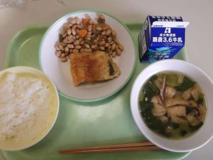今日は「五目煮豆」の中に小さな〈ハート型〉の《にんじん》が入っていました。