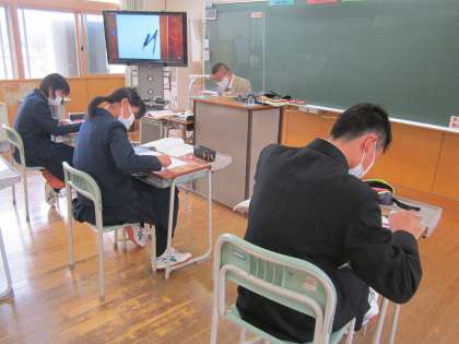 2年5限 数学 公開日 2021/11/02 更新日 2021/11/02 日々の活動から 11月2日(火) 2年生の数学の授業の様子です。 教科担当者の自作プリントを使って、三角形の合同条件を見付ける学習をしていました。