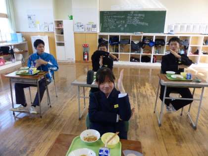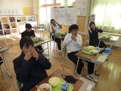 11月4日(木) 1年生の給食風景です。 今日も楽しいポーズありがとうございました。