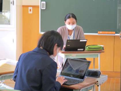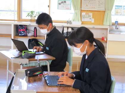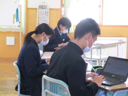 2年3限 「総合的な学習の時間(楡の木タイム)」 公開日 2021/11/05 更新日 2021/11/05 日々の活動から 11月5日(金) 2年生の「総合的な学習の時間(楡の木タイム)」の様子です。 「地域と共に生きるとは?」という内容で、タブレット端末を使って自分の考えをまとめました。