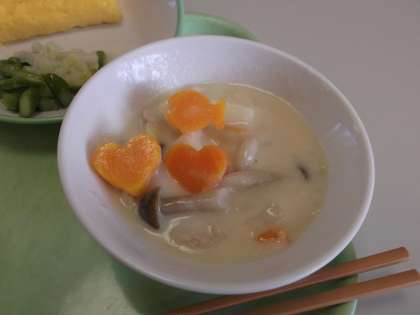 今日は、シチューの中に〈ハート型〉の《にんじん》が2つと〈小魚型〉の《にんじん》が入っていました。
