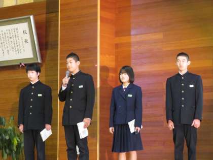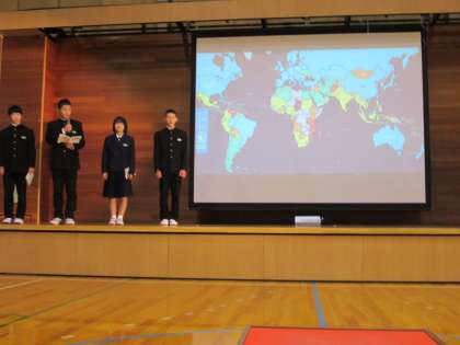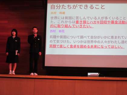 第5回 小中合同学習発表会 3年生 公開日 2021/11/13 更新日 2021/11/13 日々の活動から Bグループの発表の様子です。 「人間 貧困と飢餓」のテーマについて、「調べたこと」「これから取り組んでいきたいこと」を発表しました。 これからも募金活動に参加したいということや「世界中の人が笑顔で食卓を囲める世の中になってほしい」ということ等を伝えました。