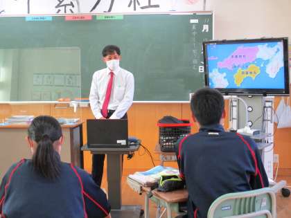 2年6限 社会 公開日 2021/11/17 更新日 2021/11/17 日々の活動から 11月17日(水) 2年生の社会の授業の様子です。 「四国と中国地方の自然と気候について知ろう」という内容の授業でした。
