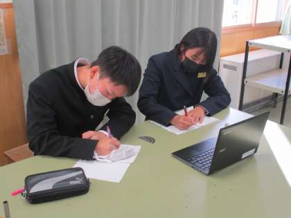 岩瀬中学校の1年生が学んだことをメモしたり、発表後に質問をしたりし、とてもよい交流となりました。