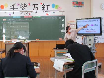 2年5限 英語 公開日 2021/11/18 更新日 2021/11/18 日々の活動から 11月18日(木) 2年生の英語の授業の様子です。 「私たちの社会にユニバーサルデザインが必要なのはなぜ?」という内容の授業でした。