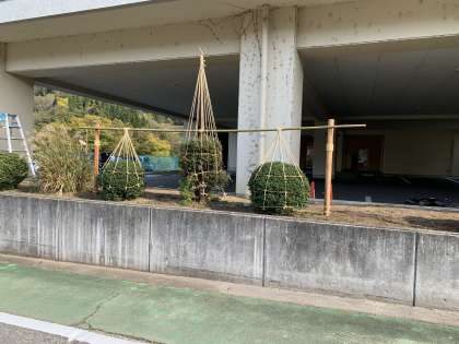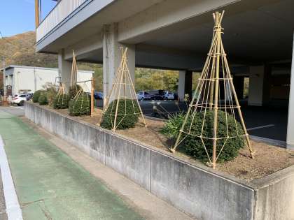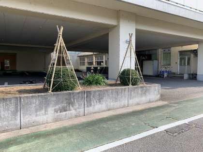 昨年のような大雪から植木を守るために、本校用務員が丁寧に雪囲いをしています。
