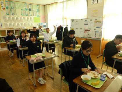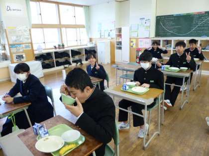 11月30日(火) 3年生の給食風景です。 速く食べ終わった人はマスクをします。 放送当番の生徒もいました。