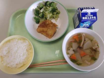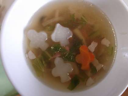 今日は「かぶのスープ」の中に〈クローバー型〉の《かぶ》と《にんじん》が入っていました。