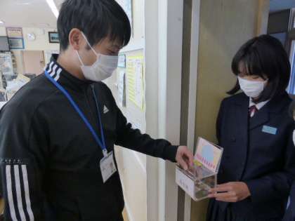 生徒会執行部 「赤い羽根共同募金」 公開日 2021/12/04 更新日 2021/12/04 生徒会活動 12月3日(金) 昨日、生徒会執行部の企画である「赤い羽根共同募金」の募金期間最終日でした。 先月から始まった募金活動では全校生徒が積極的に募金し、たくさんの募金額が集まりました。 今回の募金活動で集めた金額は地域福祉などに役立てられます。 ユネスコスクールとして楡中生は積極的に奉仕活動に取り組んでいました。