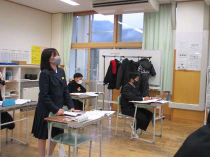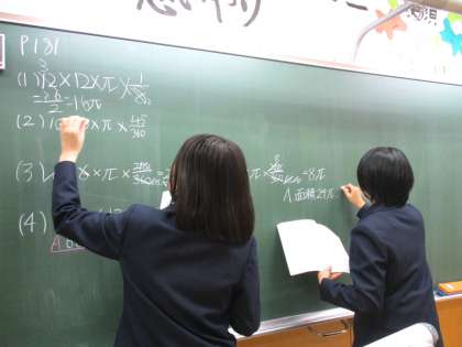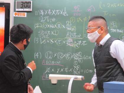 1年6限 数学 公開日 2021/12/07 更新日 2021/12/07 日々の活動から 12月7日(火) 1年生の数学の授業の様子です。 前半は、おうぎ形の弧の長さと面積を求める問題の確認をしました。
