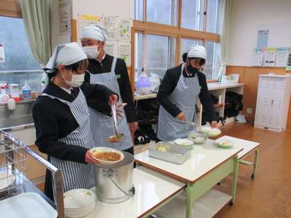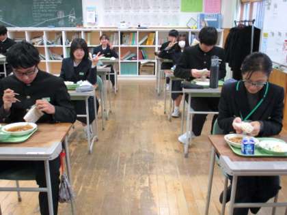 12月8日(水) 3年生の給食風景です。 当番の準備風景と食事風家です。