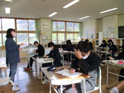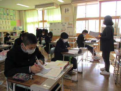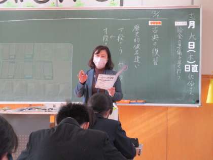 3年3限 国語 公開日 2021/12/09 更新日 2021/12/09 日々の活動から 12月9日(木) 3年生の国語の授業の様子です。 「古典の復習」という内容の授業でした。 歴史的仮名遣いなどについて振り返っていました。