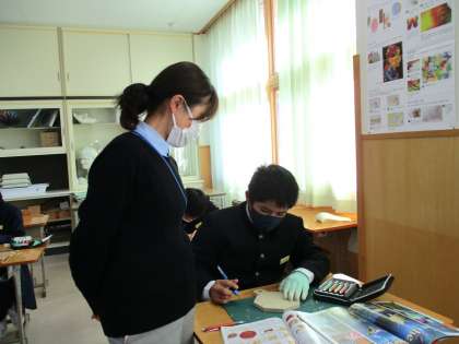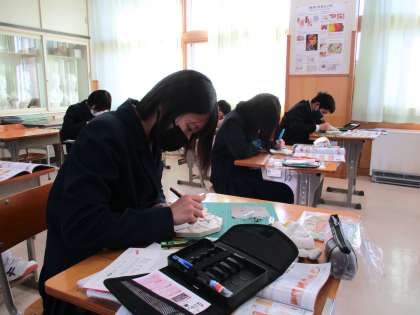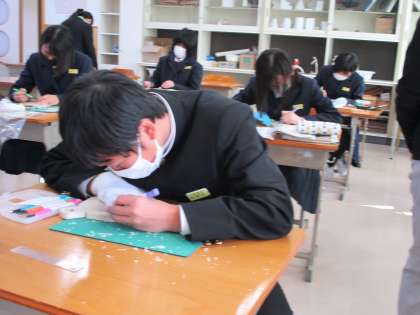 12月14日(火) 1年生の美術の授業の様子です。 1限に続いて、一生懸命に彫刻刀で彫っていました。