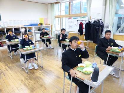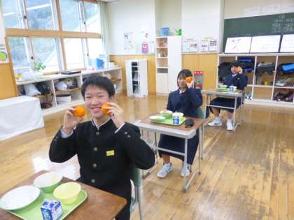 12月16日(木) 1年生の給食風景です。 今日のアイテムは「みかん」 両手にみかん、最高の笑顔!