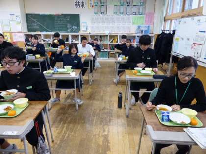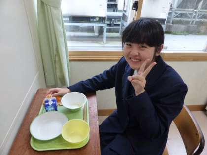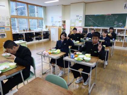 3年 給食風景 公開日 2021/12/16 更新日 2021/12/16 日々の活動から 12月16日(木) 3年生の給食風景です。 放送当番の生徒もいました。 教室と放送室、離れているのにどちらもピースサインで、以心伝心?