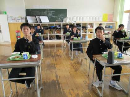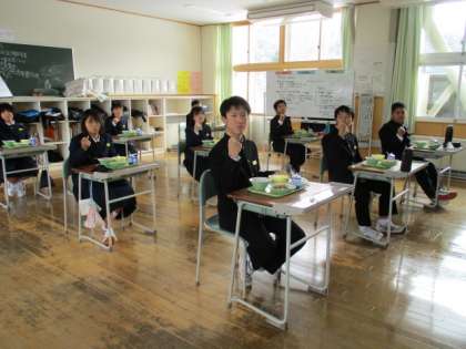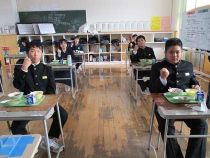 12月20日(月) 1年生の給食風景です。 じゃんけん大会? 「最初はグー」