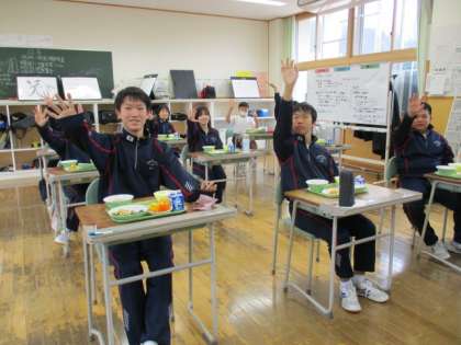 12月22日(水) 1年生の給食風景です。 「給食、おかわり欲しい人?」 1年生は、みんな大食漢です!?