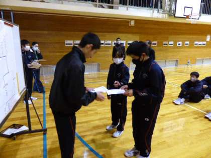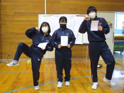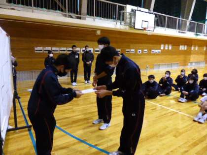 歯ピカピカ月間 表彰式 公開日 2021/12/22 更新日 2021/12/22 日々の活動から 12月22日(水) 球技大会後に歯ピカピカ月間の表彰式が行われました。 上から1位、2位、3位です。 おめでとうございました。 これからも歯をピカピカにしましょう。