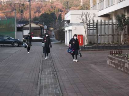 登校風景 公開日 2021/12/23 更新日 2021/12/23 日々の活動から 12月23日(木) 今朝は快晴で、放射冷却によりとても寒い朝を迎えました。 今学期も今日を含めて残り2日。 生徒たちもまもなくやってくる冬休みに向けて、心なしかわくわくしながら登校してきて来ているように感じます。