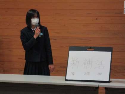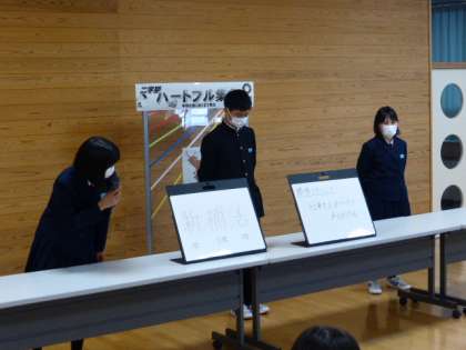 5限 ハートフル集会 公開日 2021/12/23 更新日 2021/12/23 日々の活動から 次は2年生でした。 2年生が選んだ今年の漢字は「新」でした。 1年生同様、各賞の発表があり、一言がありました。