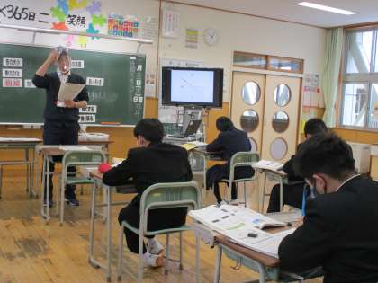 1年2限 理科 公開日 2022/01/13 更新日 2022/01/13 日々の活動から 1月13日(木) 1年生の理科の授業の様子です。 「音の正体は?」という内容の授業でした。 キーワード =「物体の振動」「振幅」