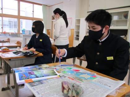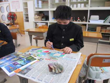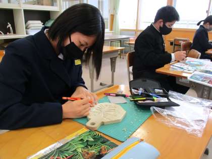 1年2限 美術 公開日 2022/01/18 更新日 2022/01/18 日々の活動から 1月18日(火) 1年生の美術の授業の様子です。 「なべ敷き」を彫っている人と、彫り終わって着色している人がいました。