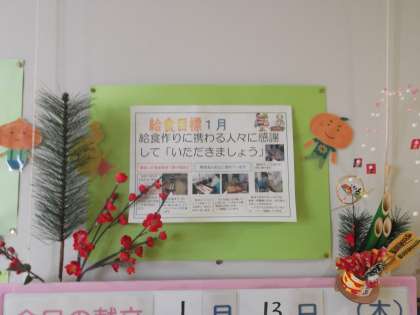 職員室前給食メニューボードの周りに、毎月調理員さんがデコレーションを飾ってくれています。