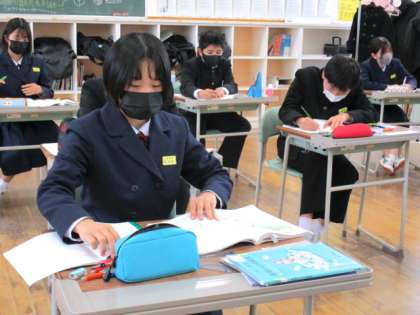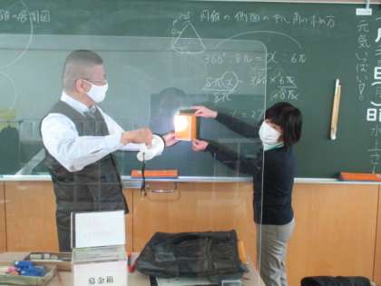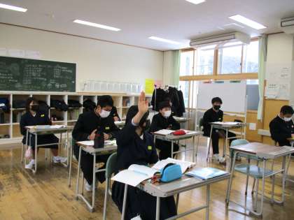 1年3限 数学 公開日 2022/01/24 更新日 2022/01/24 日々の活動から 1月24日(月) 1年生の数学の授業の様子です。 今日は、数学が急遽2時間となりました。 2限目に引き続き数学の授業でした。 立体の投影図について学習しました。 Q「正面から光を当てたら、影はどんな形?」 Q「上から光を当てたら、影はどんな形?」 Q「それでは、この立体は何でしょう?」 A「正四角錐です。」 多くの生徒が積極的に発言をしています。