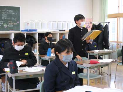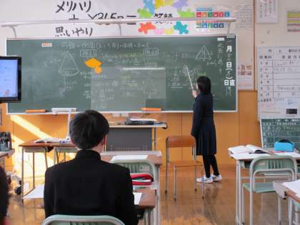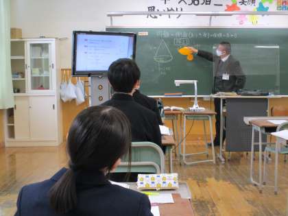 1年2限 数学 公開日 2022/01/27 更新日 2022/01/27 日々の活動から 1月27日(木) 1年生の数学の授業の様子です。 説明を聞き、自分で考え、その場で発表したり、黒板に出て発表したりするなど、様々な活動を取り入れた学習となっていました。