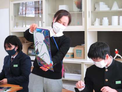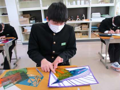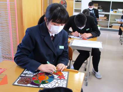 3年3限 美術 公開日 2022/02/01 更新日 2022/02/01 日々の活動から 2月1日(火) 3年生の美術の授業の様子です。 ステンドグラスの制作をしていました。 だいぶ全体像が見えてきましたね。