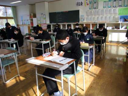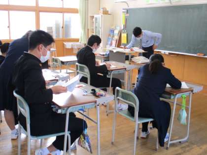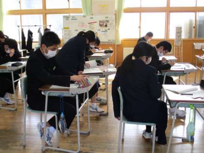 2月2日(水) 3年生の社会の授業の様子です。 明日の私立高校一般入試に向けて必死に頑張っています。
