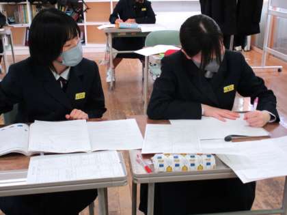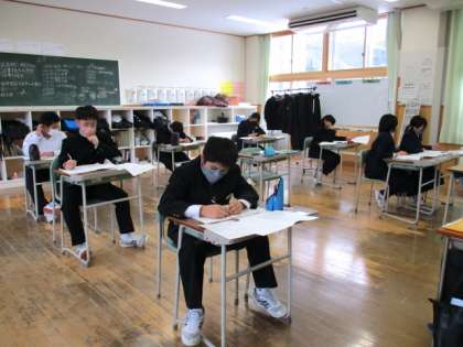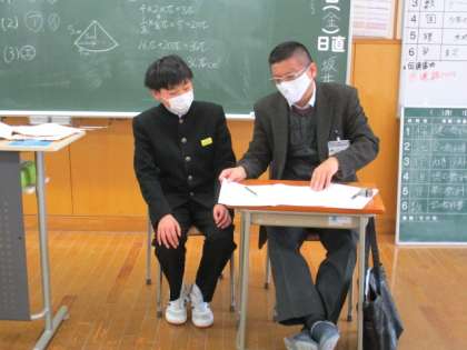 1年6限 数学 公開日 2022/02/04 更新日 2022/02/04 日々の活動から 2月4日(金) 1年生の数学の授業の様子です。 復習をした後で、昨日の実力テストの見直しをしました。 積極的に質問する生徒もいました。