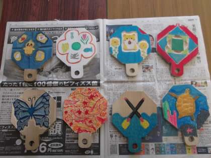 1年生の美術の授業で制作して生きた鍋敷きが完成し、美術室に展示されています。