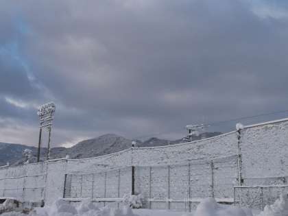 今朝は冷え込みが強く、早朝まで降っていた雪がグラウンドのネットに張り付いてました。