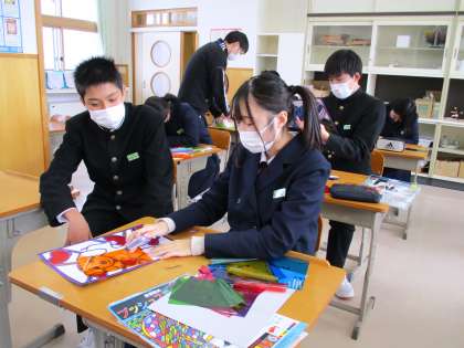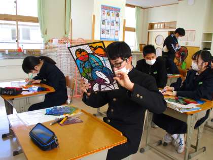3年3限 美術 公開日 2022/02/08 更新日 2022/02/08 日々の活動から 2月8日(火) 3年生の美術の授業の様子です。 ステンドグラスの制作をしていました。 完成が近づいてくると、すばらしいできばえが分かってきましたね。