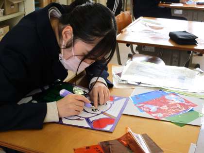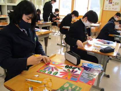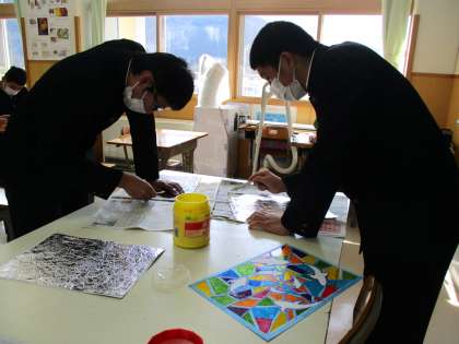 3年3限 美術 公開日 2022/02/15 更新日 2022/02/15 日々の活動から 2月15日(火) 3年生の美術の授業の様子です。 ステンドグラスの製作をしています。 もうすぐ完成のようです。