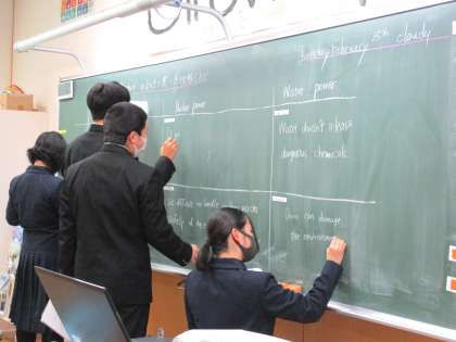 3年6限 英語 公開日 2022/02/15 更新日 2022/02/15 日々の活動から 2月15日(火) 3年生の英語の授業の様子です。 「各エネルギーの長所と短所を比較しよう」という内容の授業でした。