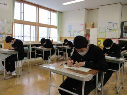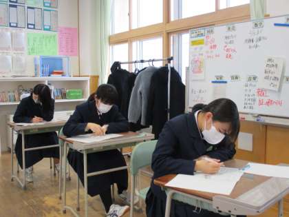 2月17日(木) 3年生の数学の学年末考査の様子です。 入試問題のように作問してあります。 力試しに頑張れ!