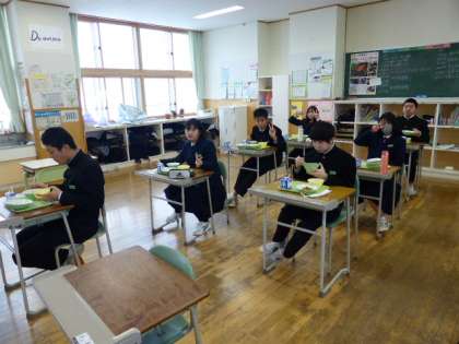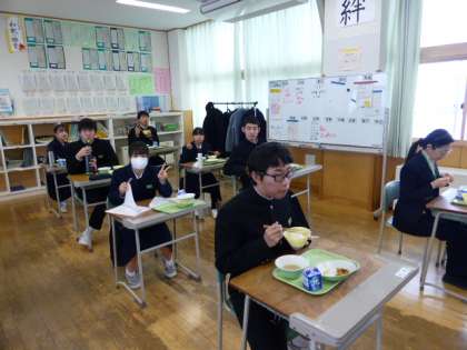 2月17日(木) 3年生の給食風景です。 放送当番の生徒もいました。 3年生の給食はあと14回です。