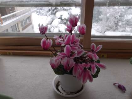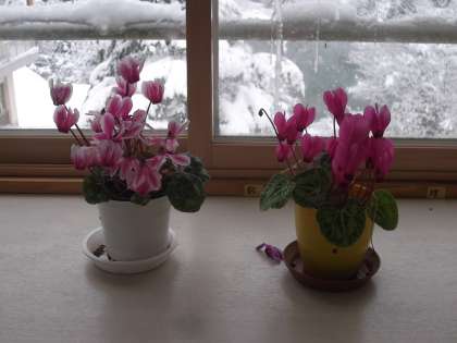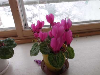 1年生の教室のシクラメンは、とても元気に咲き誇っています。 昨年からの越冬したシクラメンです。