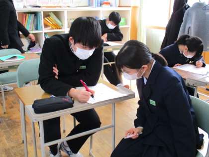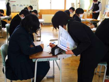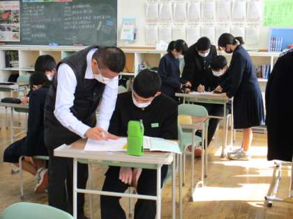 3年3限 数学 公開日 2022/02/25 更新日 2022/02/25 日々の活動から 2月25日(金) 3年生の数学の授業の様子です。 入試予想問題に取り組みました。 さまざまなところで教え合う姿が見受けられました。