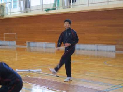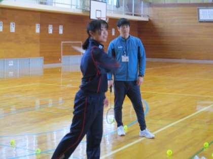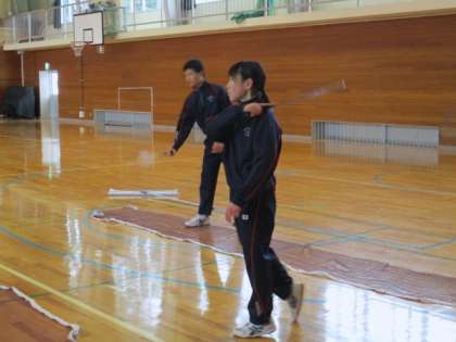 2月28日(月) 2年生の保健体育の授業の様子です。 バドミントンのサーブ練習をしていました。