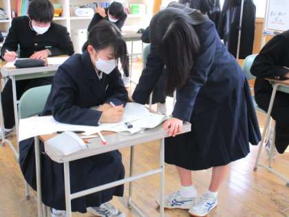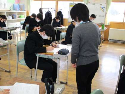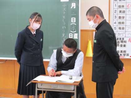 3年6限 数学 公開日 2022/03/02 更新日 2022/03/02 日々の活動から 3月2日(水) 3年生の本日2回目の数学の授業の様子です。 昨日行った第8回確認テストテストの見直しと2限に取り組んだ問題の解説も行いました。