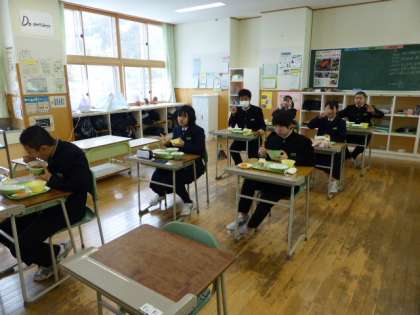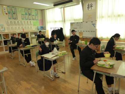 3月3日(木) 3年生の給食風景です。 放送当番の生徒もいました。 3年生の給食は、あと5回です。