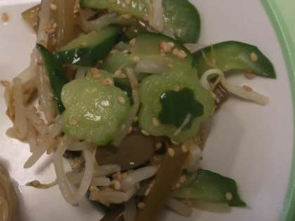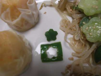 また、「茎わかめのごま酢あえ」の中に《花型》の〈きゅうり〉が入っていました。そのうちの一つは〈きゅうりの皮〉で《花型》の型抜きがされていました。