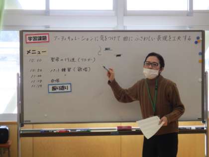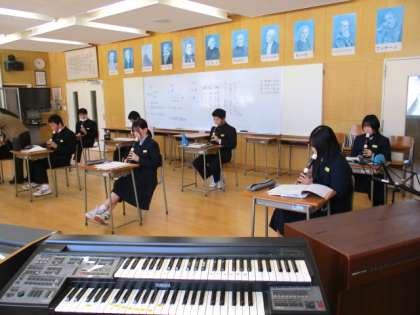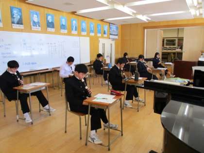 1年3限 音楽 公開日 2022/03/04 更新日 2022/03/04 日々の活動から 3月4日(金) 1年生の音楽の授業の様子です。 「アーティキュレーションに気をつけて曲にふさわしい表現をする」という内容の授業でした。